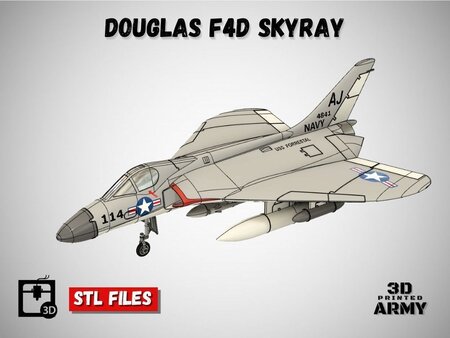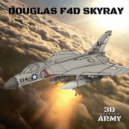 DOUGLAS F4D SKYRAY . It was in service for a relatively short time (1956–1964) and never entered combat but it was the first carrier-launched aircraft to hold the world's absolute speed record at 1211.744 km/h and the first US Navy and US Marines corps fight that could exceed MACH 1 in level flight It's very original and beautiful with his delta wing and equiped with external fuel tank , missiles and rocket pod a small PDF guide is provided to help you to print your model and to assemblr it correctly Take a look to my new Facebook page her : https://www.facebook.com/3DPrintedARMY like it and follow me for lot of new models and my Pinterest page here https://www.pinterest.fr/3DprintedARMY/_created/
