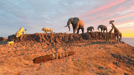Animal world scene. Including lions, elephants, giraffes and foxes
