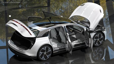 Electric Luxury Sedan Lucid Air Rigged is fully rigged and is ready to be animated. You can easily position it the way you need or animate it the way your project requires using helpers in 3D Studio Max. See the turntable to get an idea of how rigging works. Electric Luxury Sedan Lucid Air Rigged has a detailed interior. Doors can be opened. The pose with open doors on the render images is an example and can be easily recreated using rig, it is not initially included into the product.
