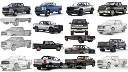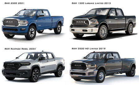 Collection of pickup trucks from the RAM brand. Includes: RAM Rampage Rebel 2024, RAM 3500 HD Limited 2019, RAM 2500 2021, RAM 1500 Laramie Limited 2015. The main elements are prepared for TurboSmooth smoothing (2 Iteration). The body elements, wheels, and interior have been worked out - conditionally.