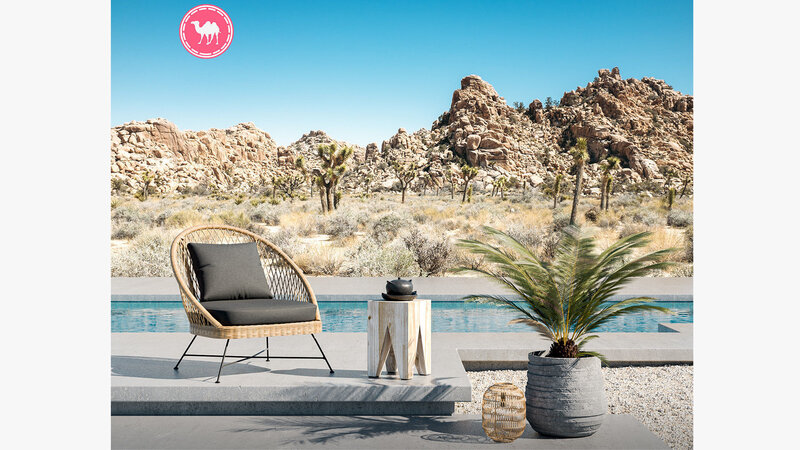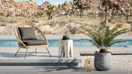 This outdoor set is inspired by Tropical and Bohemian design. This set of furniture matches the typical oasis type arid environment.