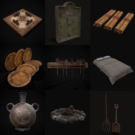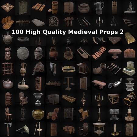 100 High Quality Medieval Props Two - 100 3D Models- Files Include FBX and OBJ. Includes PBR Texture in 4096 x 4096. - Maps include : Basecolor, Normal, Roughness, Height and Metallic. Some models include AO, SSS, Opacity and Emmisive maps. All Preview renders were done Marmoset Toolbag 4 Scaled to real world scale.