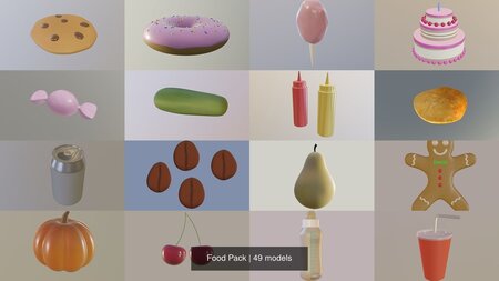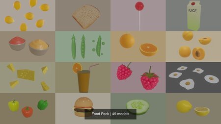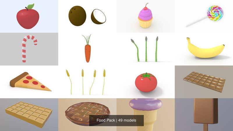 This set includes 50 food items: Fruits, vegetables, bottles, candy, berries, slices.. Most foods are under 50k polys and game ready. Some have normal map included. Formats: Fbx, Obj, Stl, Dae. Total value: 300$ - You pay only 139$