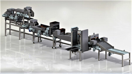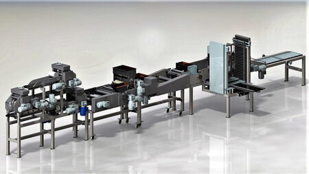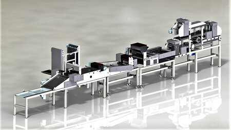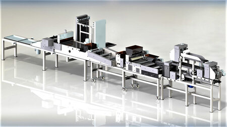 The line is made up of four machines. 1.Laminat, for preparation of a test on a width of 180mm and thickness from 1 to 20 mm. 2.Knife for longitudinal cutting on strips of width from 8 to 50 mm. 3.Bath for dipping the dough strip and sprinkling with salt or sesame ...