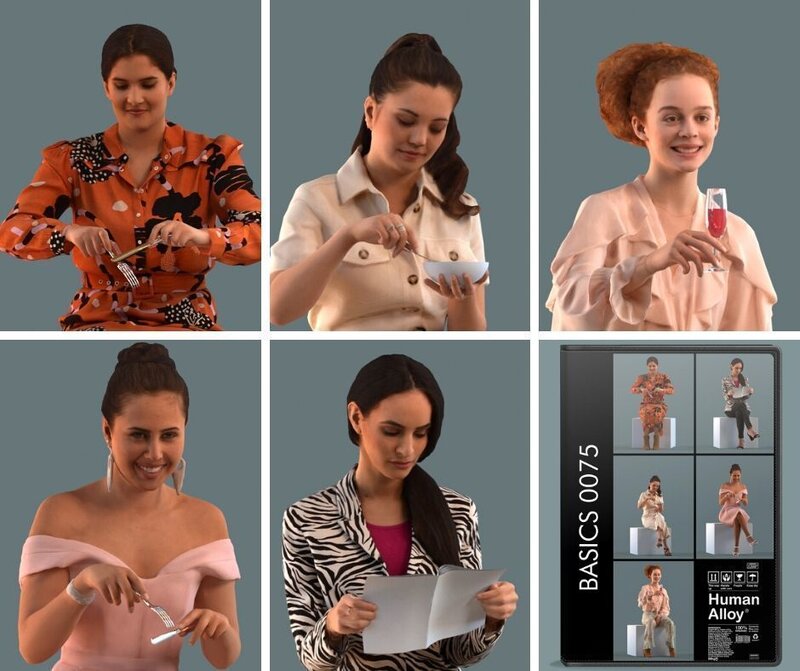 Most of the times 3D people need to blend seamlessly into the background of your visualizations. Human Alloy "Basics’ 3D people do just that. They are lightweight, easy to drop in your 3D scene and won’t clog-up your computer and at a appropriate price at that.