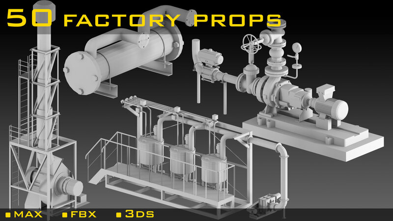 This product includes 50 factory props- (low poly) 3d models in 3 formats