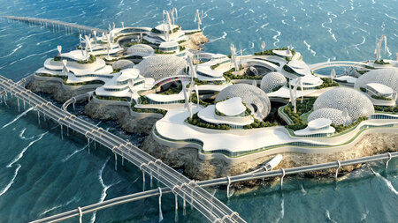 Detailed 3D model of an ecological city of the future. Based on bionic architecture. Uses alternative energy.