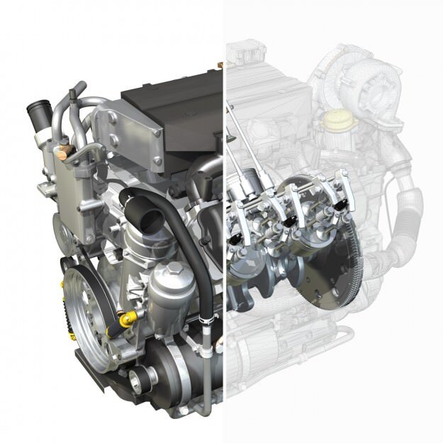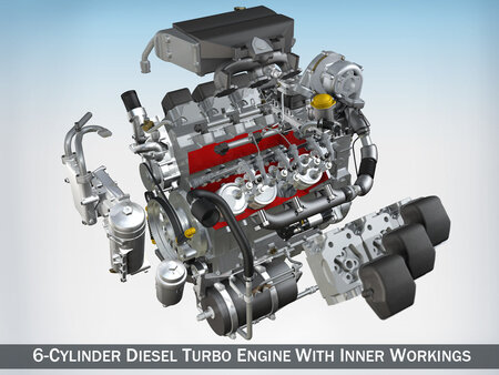 Diesel engine with 6 cylinders in Vee-type Konfiguration with inner workings parts in an schematic manner.
