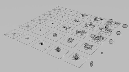 This package contains 45 packs of low-poly fruit trees set, each one has 5 stages of growth with 45 types of fruits, 4 variety dirt. There is 1 file that includes all models and there is also a file that is separated into 274 files each (45 fruits, 225 trees, 4 items).