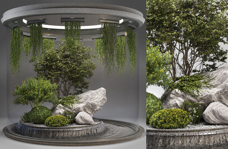 The indoor garden surrounded by glass contains: Waterfalls and Plants, Bushes, gravel, trees, and Hanged ivy. In the archive: 3ds max 2018 file (Corona) 3ds max 2018 file (Vray)